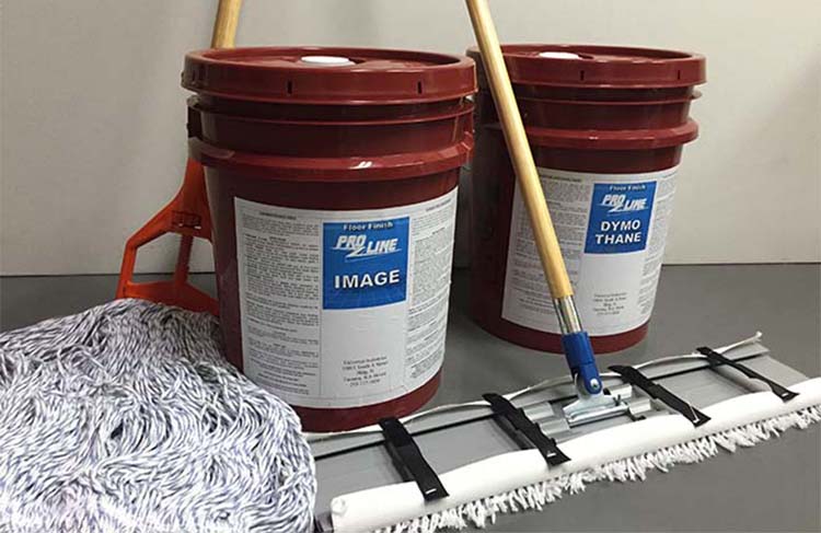 ProLine Image & Dymothane floor finish are available in 5 gallon containers. Traditional wax mops or ProLine finish applicators are also available.